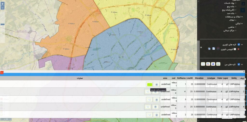 - مشاهده اطلاعات توصیفی بصورت جدول در کادر پایین نقشه با قابلیت نمایش اطلاعات منطقه قابل مشاهده در کادر زوم شده نقشه به همراه قابلیت های زیر: