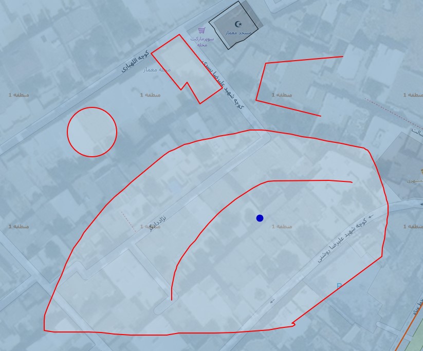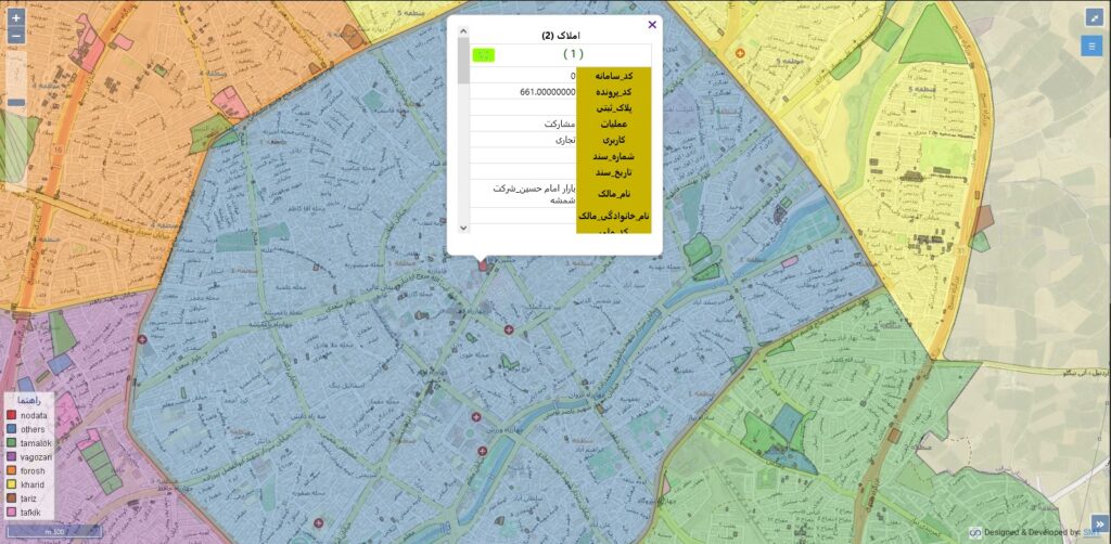 با انتخاب این ابزار و با کلیک بر روی عارضه های موجود در لایه های من بر روی نقشه عارضه مد نظر انتخاب شده و می توان اطلاعات توصیفی آن را در پنجره ای قابل جابجا در محیط مشاهده کرد و همچنین بصورت اختصاصی برای هر عارضه فیلد اطلاعات خاص تعریف و تکمیل کرد.