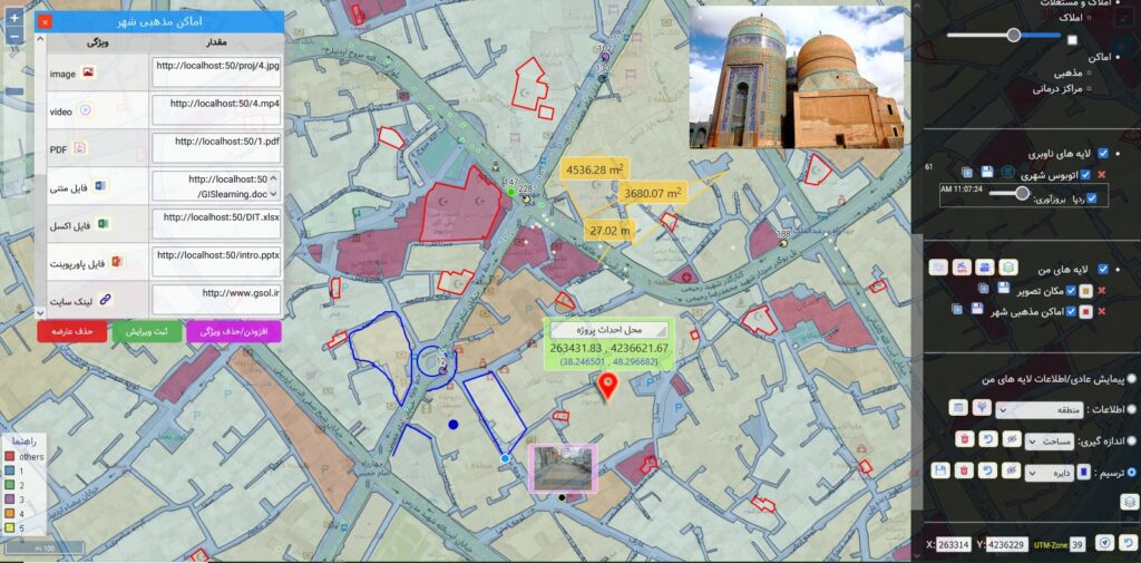 - باز شدن پنجره ی اطلاعات توصیفی با کلیک بر روی عارضه در محیط نقشه و امکان کپی کردن آن در لایه ترسیمی، همچنین امکان افزودن لینک جهت فراخوانی اطلاعات از سایر سیستم ها و بانک های اطلاعاتی.
